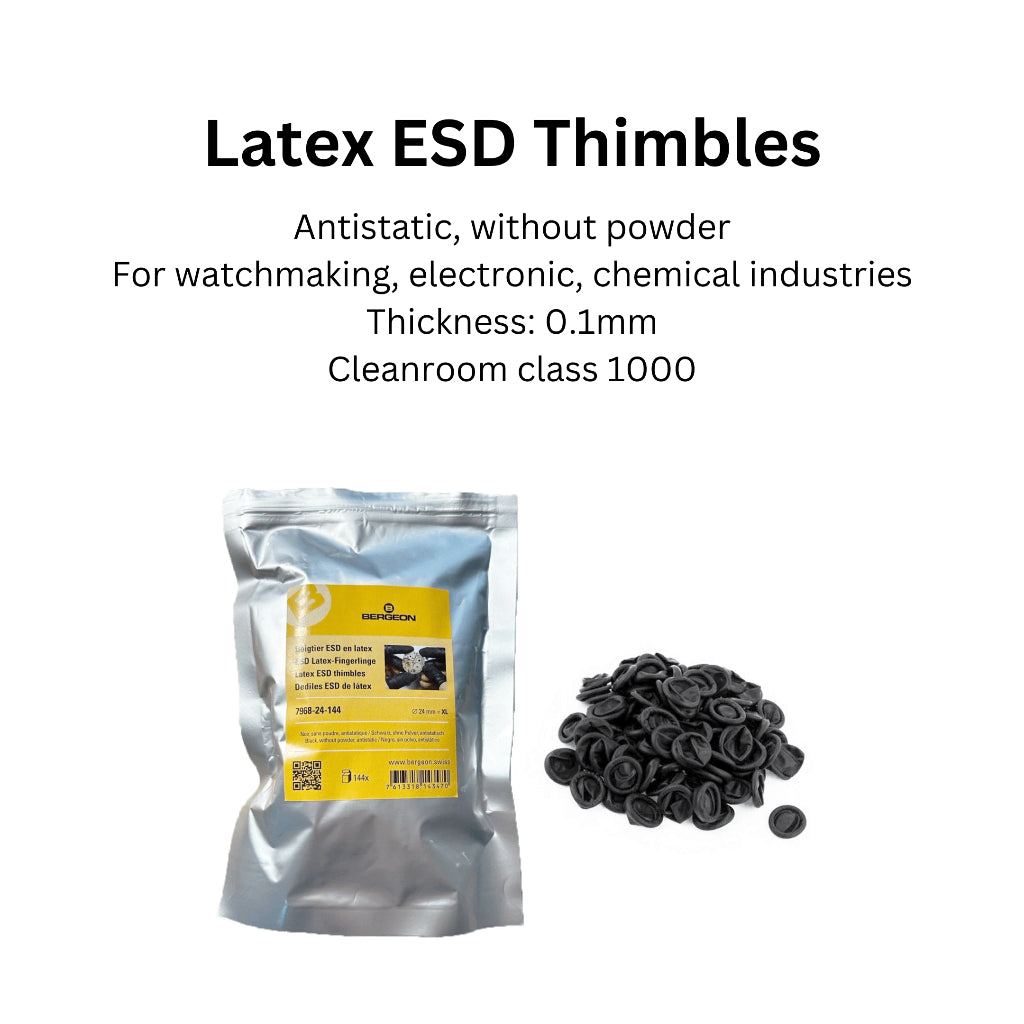 Elevate your watchmaking craftsmanship with the Bergeon 7968 ESD Latex Finger Cots. Specifically engineered for precision work, these Swiss-made finger cots are the ideal choice for professionals dealing with delicate components. Crafted from premium, powder-free latex, they provide excellent elasticity and a snug fit, ensuring comfort during extended use. The black, anti-static design is perfect for environments sensitive to electrostatic discharge (ESD), making these finger cots indispensable in watchmaking, electronics, and other high-precision industries.