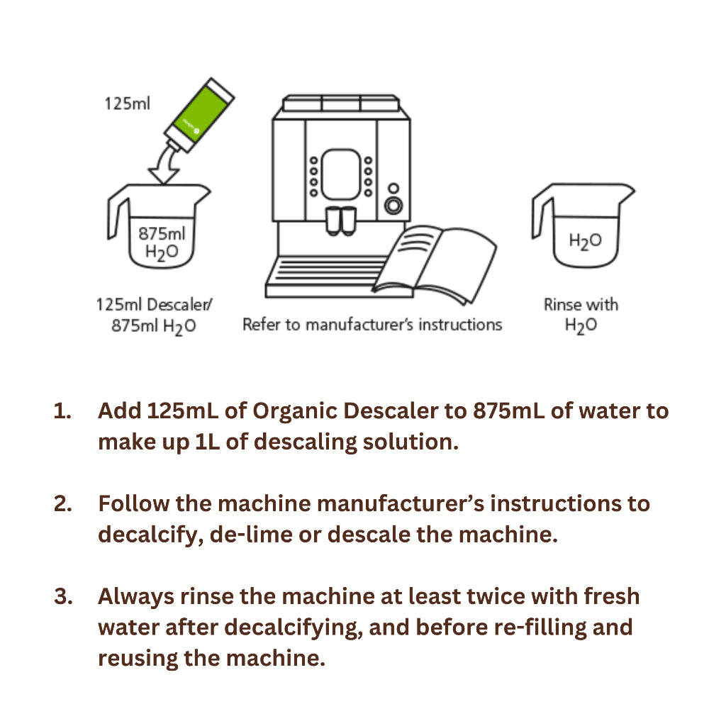 - Mixing: Add 125ml of Cafetto Organic Liquid Descaler to 875ml of water to prepare 1L of descaling solution.