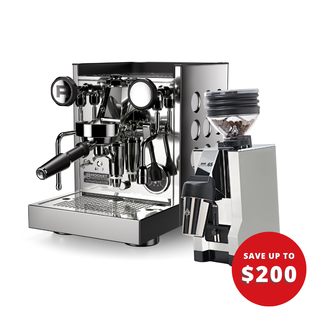 Elevate your home brewing to professional standards with this premium bundle. The Rocket Appartamento TCA espresso machine, renowned for its Italian craftsmanship, pairs seamlessly with the Eureka Mignon Zero 65 AP grinder, delivering precision and consistency in every cup. Together, they form the perfect duo for coffee enthusiasts seeking café-quality results at home.